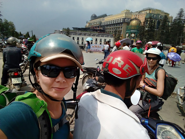 Tavallisesti Aasiassa kaikki kyllä järjestyy ja on aina saatavilla, kunhan asiakas on valmis maksamaan. Ei näin Sapassa lomakaudella - hotellimme respa ei onnistunut löytämään meille opasta, sillä kaikki oli jo varattu, eikä myöskään saanut yhteyttä kehenkään tuntemaansa homestayn omistajaan. Löysimme sentään varaussivustolta pari saatavilla olevaa homestay-majoitusta läheisestä Lao Cain kylästä, joten nappasimme kaupungista moottoripyörätaksit (yllättävän kohtuulliseen hintaan 60 000 dongia eli reilut pari euroa per pyörä) ja suuntasimme kaupungin raivostuttavasta tungoksesta pikkukylän suhteelliseen rauhaan. Otimme huoneen kivalla näköalalla (muuten ihan ok huone, paitsi että sänky oli ihan kivikova!) ja päätimme lähteä patikoimaan ympäröivälle seudulle omin päin. Seuraavaksi päiväksi isäntämme lupautui oppaaksi 400 000 dongin eli noin 15 euron hintaan.
